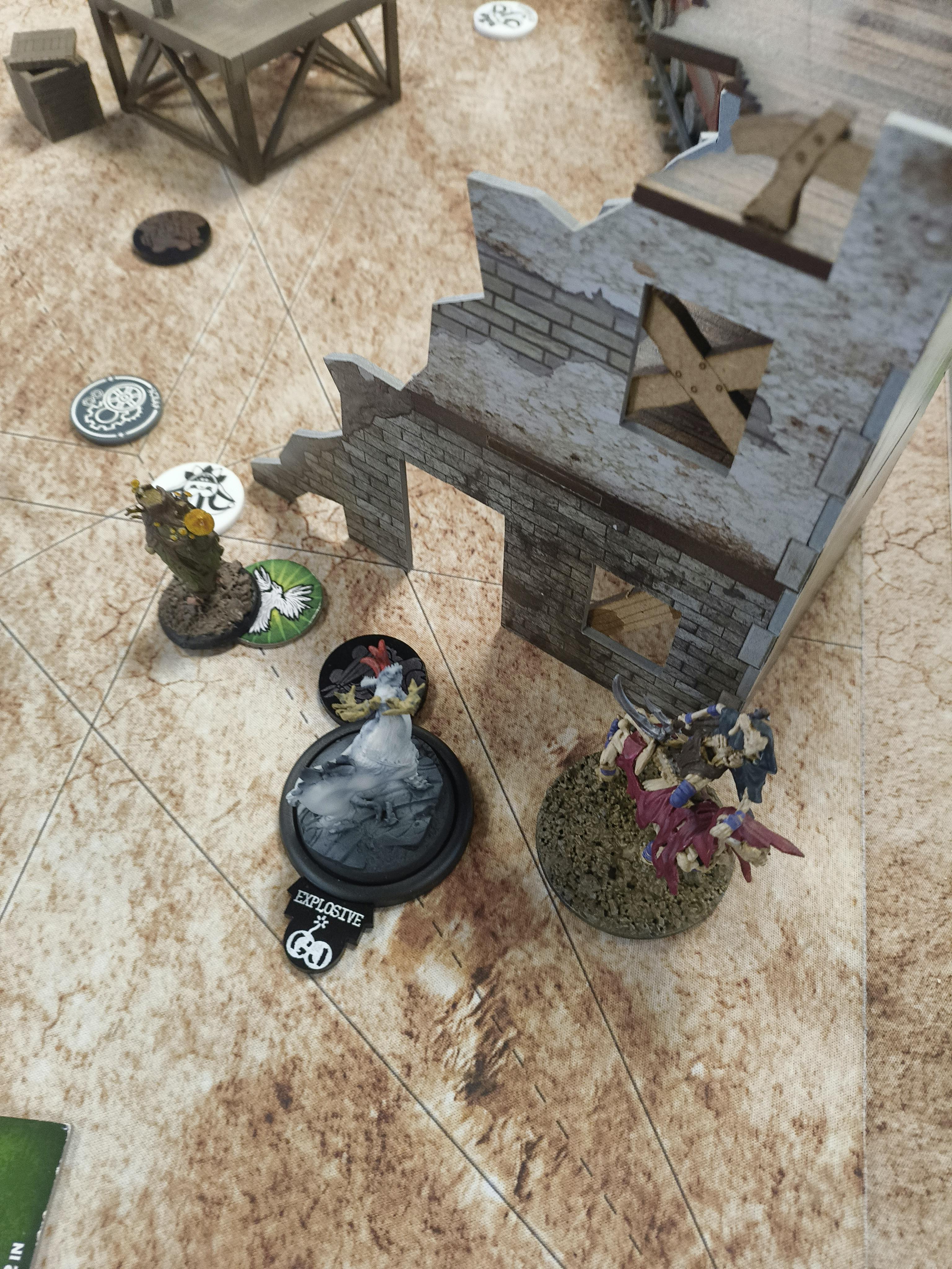 In Turn 1 I was pleased with the play. I had been pushing Kastore forward with Overheals as usual, and he was very close to the centre. Yan expected a killy charge and surge, but instead I used Visceral Rampage on my Cavern Nephilim to move it into Yan’s territory. Then I used the ability on one of his models to move Kastore further up and block line of sight. Luckily, I decided to take a punt on Broodmaster’s Blade, grabbed the Tome, and placed Marathine near me so she could charge the Wendigo. The attack flipped a Red Joker on damage and killed the Wendigo in one shot! Yan was not impressed with this series of plays. It was not something that could be planned, but I am sure it still felt bad for him. Even my offer of grapes did not make up for it. He also experienced several other unfortunate flips. An interesting benefit of my positioning was that in Turn 2, the Cavern Nephilim could move through the train using Expert Getaway and later drop an explosive and two schemes to set up for Espionage.