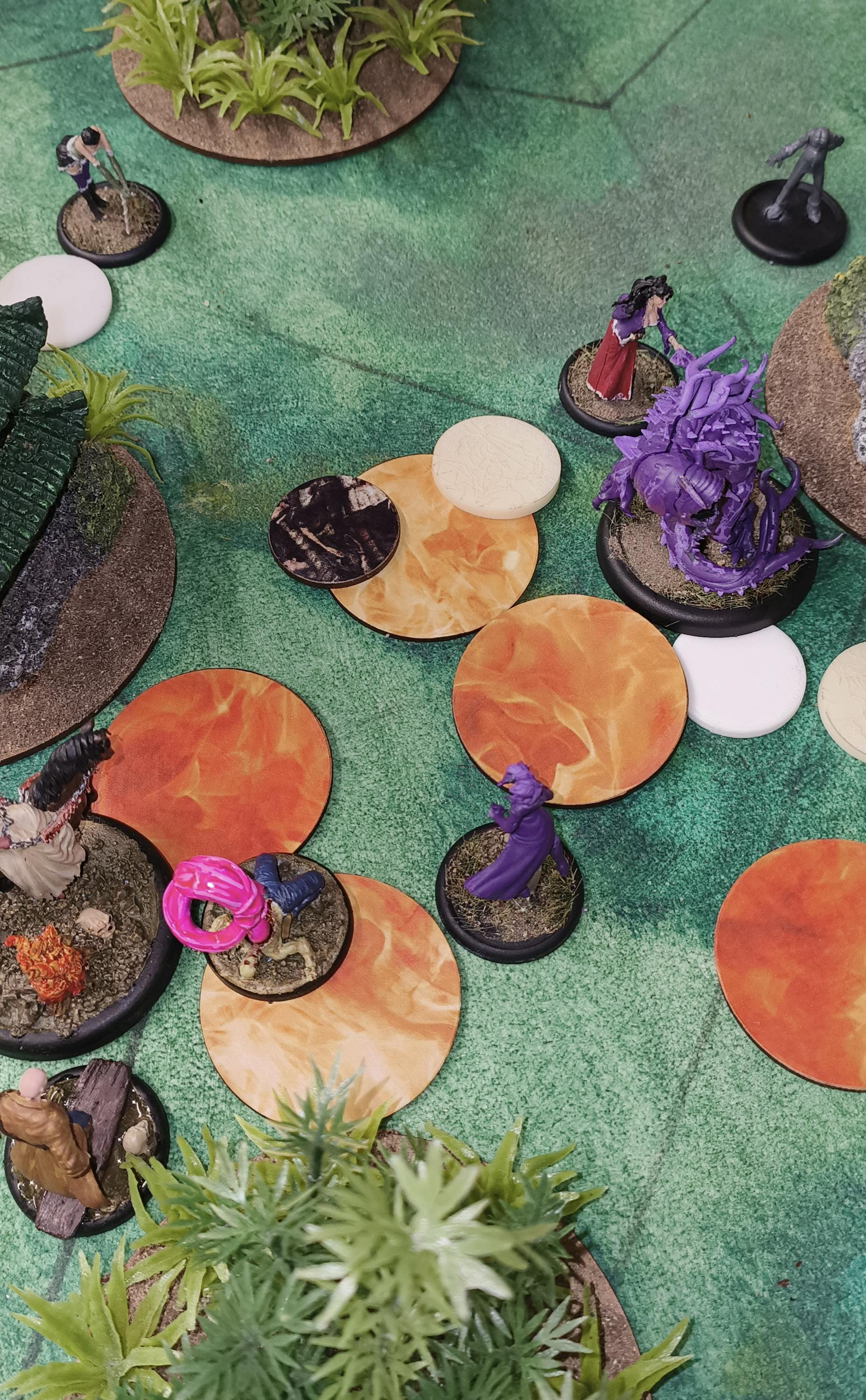 While I was doing this, Dan move the Hungering Darkness close to one of my Lampads. There were a lot of tricky auras in his crew to contend with - Gwyneth can hand out Brilliance Tokens, Mr Tannen can set up Boring Conversation, Jakob can make you take damage if you Cheat Fate. So, I was trying to avoid those models! Luckily the Hungering Darkness was close enough to me that I could do that, so I concentrated my attacks on it. The Lampad failed to hit, but Vincent St Clair can do a surprising amount of damage if he keeps shooting, and I managed to drop the Hungering Darkness turn 2 - after Dan had done some cunning positioning to move it back into the fray.