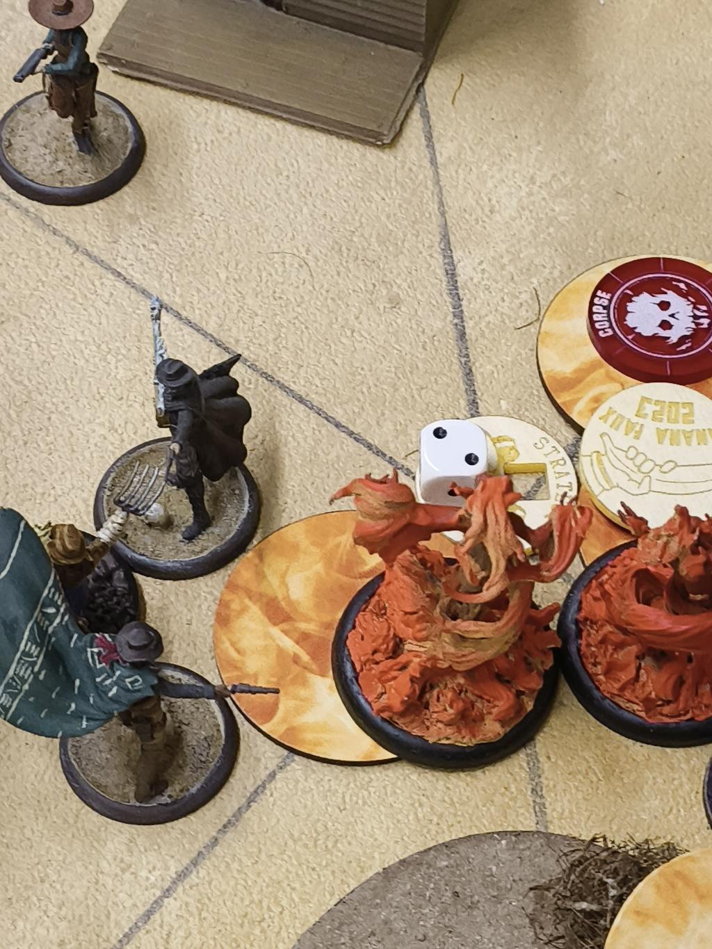 When we arranging this game, Ed told me he'd never played against Reva before, so I picked her. He asked me which of his crews I'd like to play against, from a choice of Lady Justice, Cornelius Basse, Parker Barrows and Perdita Ortega (he loves cowboys). I've played against Lady Justice twice before, and he warned me that Basse's Order In The Badlands with the in built Tumbleweed could make for a less than fun game against Reva, as it can remove a lot of markers (Reva loves Pyre and Corpse Markers) and end a condition on multiple models. (Reva likes her crew to be gently on fire)