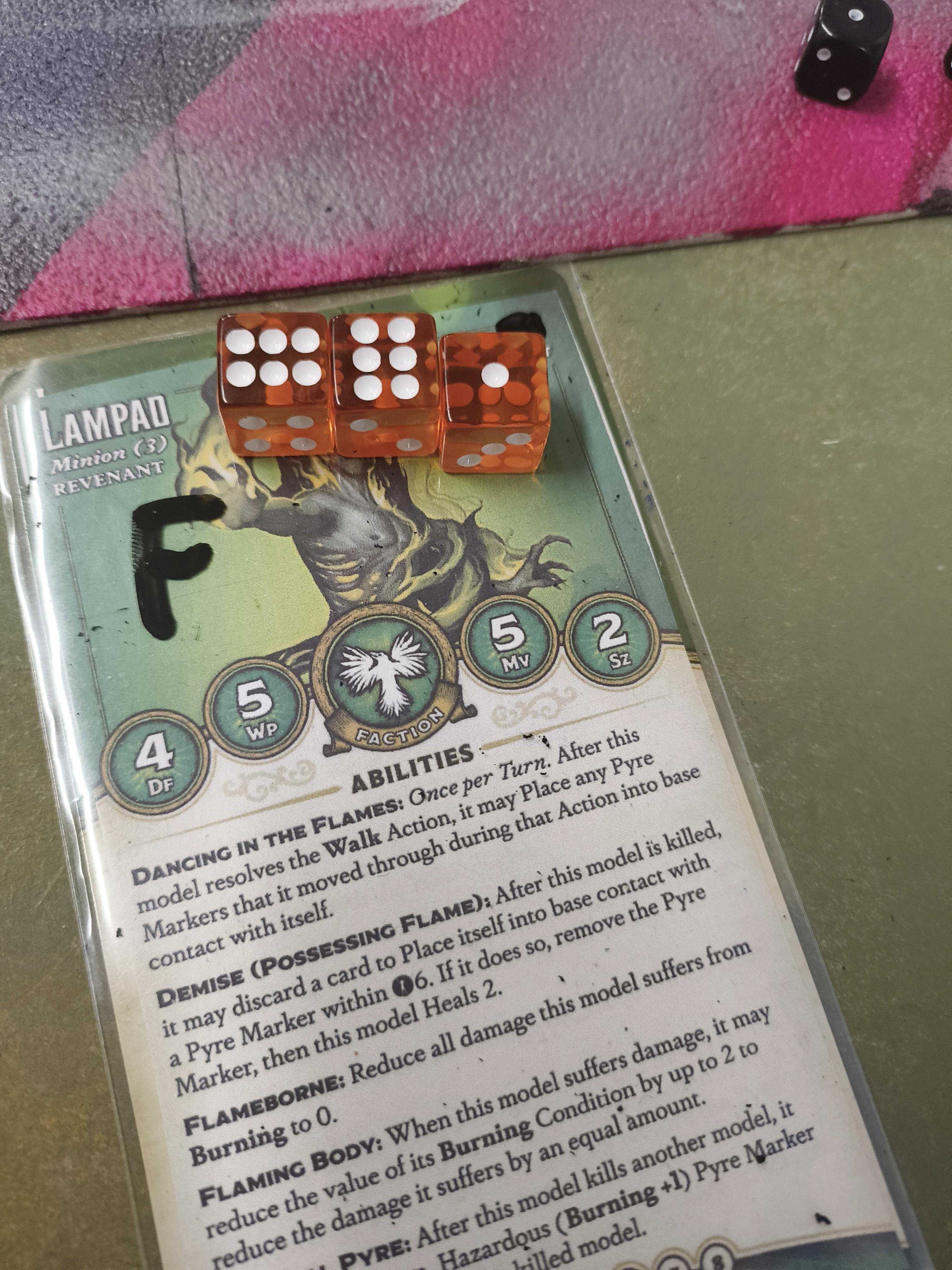 Reva didn’t fare so well. Fan the Flames and Traverse Through Ember are great. Not as great against Sensei Yu, who has Laugh Off. I also thought I had In Your Face (which wasn’t even in the scheme pool!) instead of Death Beds, and I spent a long time trying to kill Sensei Yu when I actually just needed to kill any model near a Scheme Marker and a Pyre Marker (and there were plenty of Pyres…). I finally managed it in Turn 4, when James charged a Monk into a Shieldbearer next to a Pyre Marker and a Scheme Marker, and I had two severes in hand. The previous turn, I hadn’t had the cards to do much, and had discarded the Black Joker and three cards of 4 or below. I shuffled them in without thinking, and James very honourably made me take them out of the deck so I’d have a better draw.