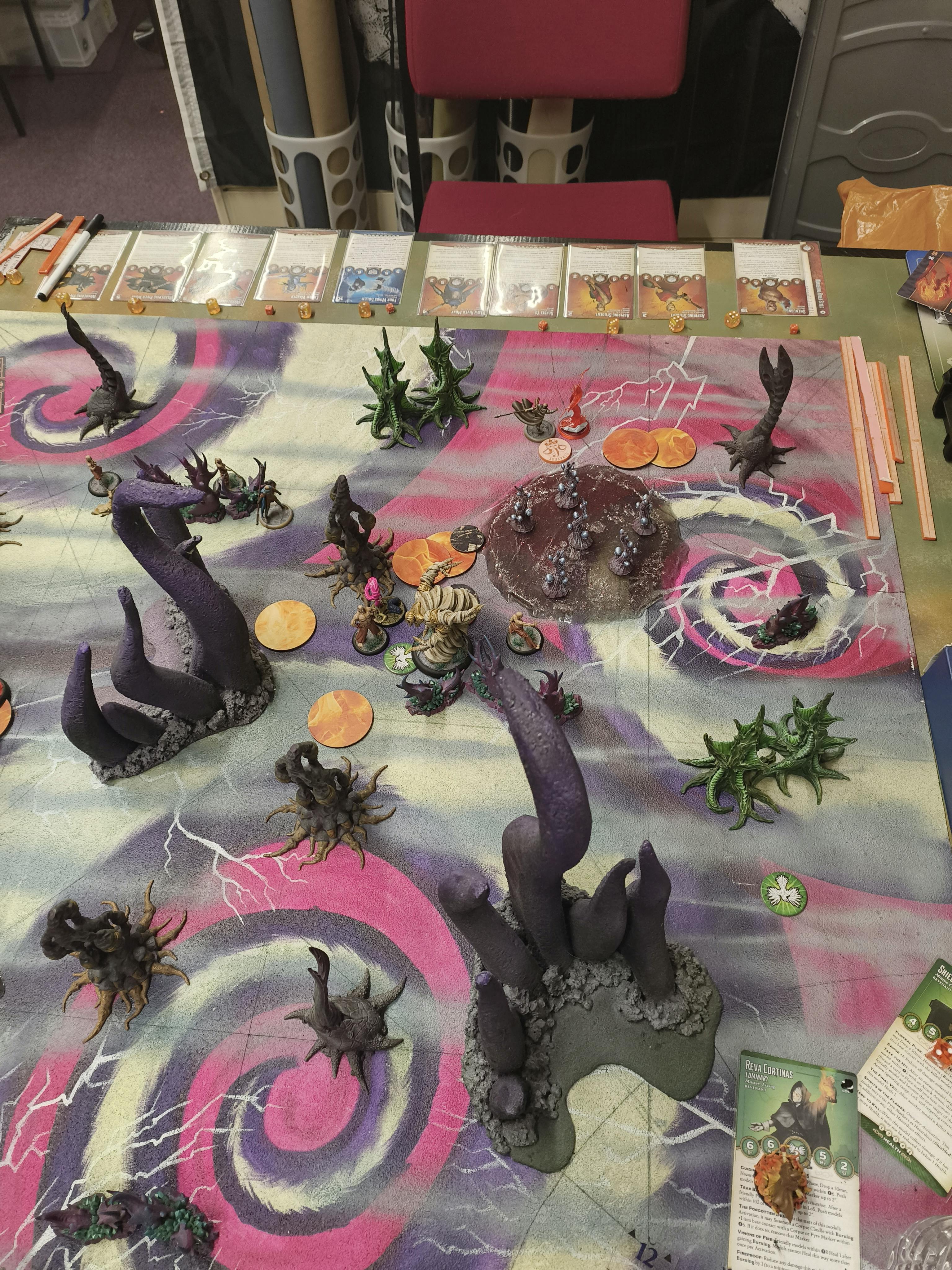I declared Reva 2, since I’ve been enjoying her lately. I chose three Shieldbearers—the idea being one could protect a Lampad on each flank, and one could look after Reva. Boosey brought a large number of Monks, so we both ended up with slightly non-standard lists. It was also my first outing with Bête Noire, whom I won in the raffle at A Breach in the North XI.
